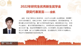 2021级机械电子工程专业金航同学作为研究生优秀新生代表发言。金航同学谈到每一个奖学金名字的背后都是一个个彻夜奋斗的夜晚。他表示会继续坚定自己的科研信念,努力提高科研素养,发扬“爱国、革命、自强、科学”的优良校风,持续弘扬嘉庚精神,用实际行动践行“自强不息、止于至善”的校训。