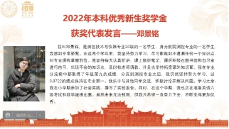 2020级测控技术与仪器专业邓景铭同学作为本科优秀新生代表发言。他谈到进入测控专业学习后,结交了一批志同道合的同学们,认识了尽职尽责的老师。此次获奖让自己更有信心和动力继续努力,并会将奖学金化作今后不竭的动力,完成新使命和征程。