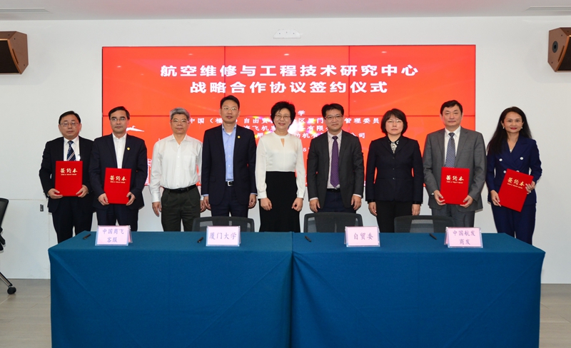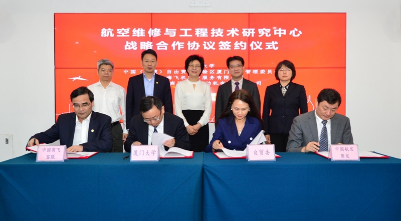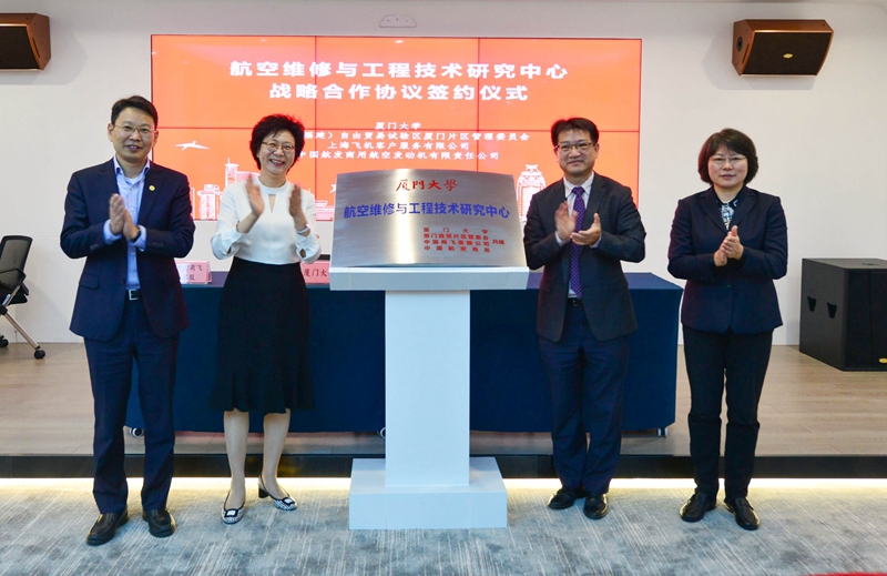 为贯彻落实中央改革办关于厦门“打造全球‘一站式’航空维修基地,服务国家大飞机战略”的要求,提升厦门航空维修产业国际竞争力,推动航空维修产业结构优化升级,促进我国民用航空产业发展,经友好协商,厦门大学、厦门自贸委、中国商飞客服公司、中国航发商发共建厦门大学航空维修与工程技术研究中心。研究中心的四方共建战略合作协议签约与揭牌仪式于2018年11月15日上午在厦门自贸区举行。