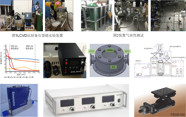 稳定可靠的实验装置是LCVD法制备高质量石墨烯的重要基础,它包括工艺主体和工艺配套两大部分。其中,工艺主体由激光聚焦单元、真空可视反应腔、聚焦光斑测量单元等几部分组成,工艺配套则包括反应源气体及控制单元、三维移动平台单元、型材支架,实验装置如图所示: